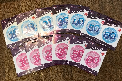 These are fab and fun! 24inch clearview helium filled balloons in pink or blue. Ages available are 16, 18, 21, 30, 40, 50, 60. Please state age and colour you would like in special instructions
