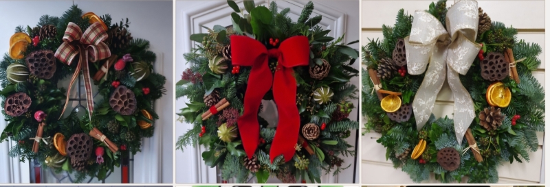 Handmade with fresh spruce, Ivy and other foliages, Cones, Berries and fruits, finished with a beautiful material bow.